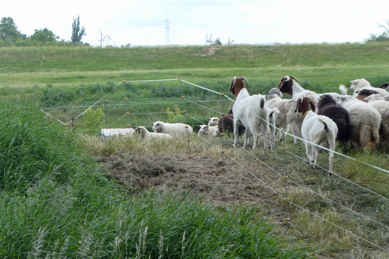 Stationäre Zaunanlagen für Schafe oder Ziegen müssen mindestens 120 cm hoch sein. Für Gehegewild gilt eine Mindestzaunhöhe von 180 cm. Förderfähig sind stromführende Litzenzäune oder nicht elektrifizierte Knotengeflechtzäune mit zusätzlichem Untergrabeschutz und Überkletterschutz. Der Untergrabeschutz kann eingerichtet werden als ein: