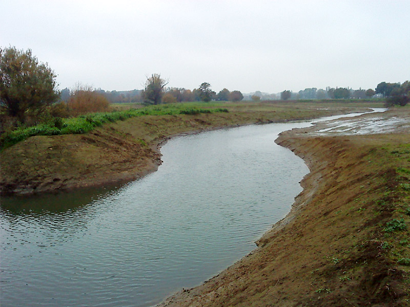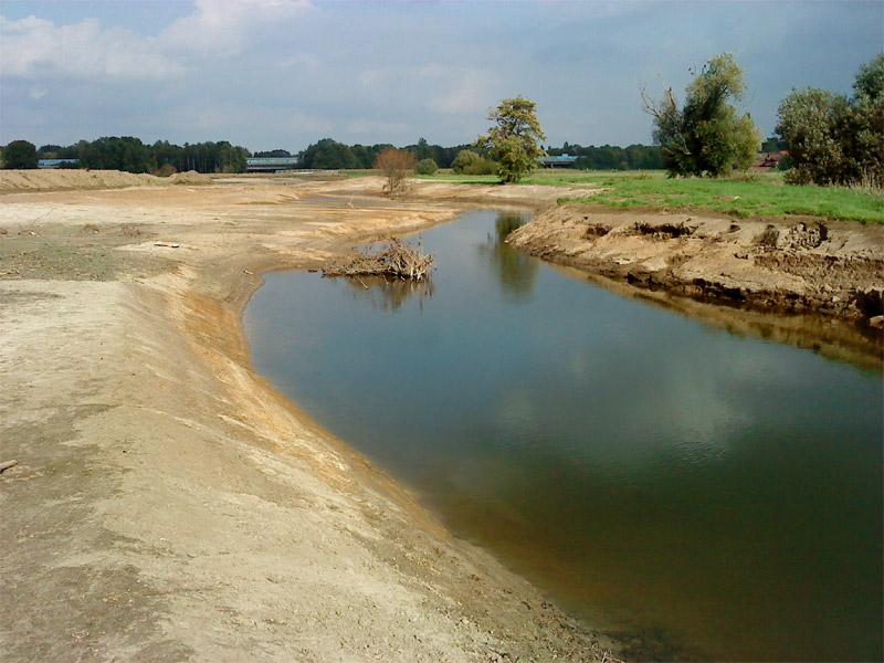 Der auf den Fotos vorgestellte 1. Bauabschnitt konnte Ende 2010 fertig gestellt werden. In einem 400 m langen Abschnitt im Elsevorland wurden ein Altarm und eine Flutrinne geschaffen und eine Deichanlage als Lückenschluss eines späteren Polders in diesem Bereich errichtet. Die zur Verfügung stehende Fläche scheint für die Initiierung und Zulassung einer eigendynamische Gewässerentwicklung ausreichend zu sein, allerdings sind Sicherungsmaßnahmen für den Fall vorgesehen, dass größere Hochwasserereignisse eine stärkere Dynamik des Fließgewässers auslösen und die Else dadurch den vorgesehenen Entwicklungskorridor verlässt. Der umgebaute Gewässerabschnitt soll zu einem Strahlursprung entwickelt werden. Die Lage dieses Strahlursprunges unmittelbar vor der Ortslage Bünde ermöglicht auch die Überprüfung seiner Wirkstrecke und damit spätere Aussagen zur Wirkung von Strahlursprüngen. Die Landwirtschaft hat durch ihre aktive Mitarbeit in diesem Projekt ihre Bereitschaft unter Beweis gestellt, die Umsetzung der WRRL aktiv zu begleiten und zu unterstützen. Die Fotos zeigen eine Gesamtsicht der Maßnahme (Luftbild) sowie die Maßnahme während und kurz nach Fertigstellung der Bauarbeiten.