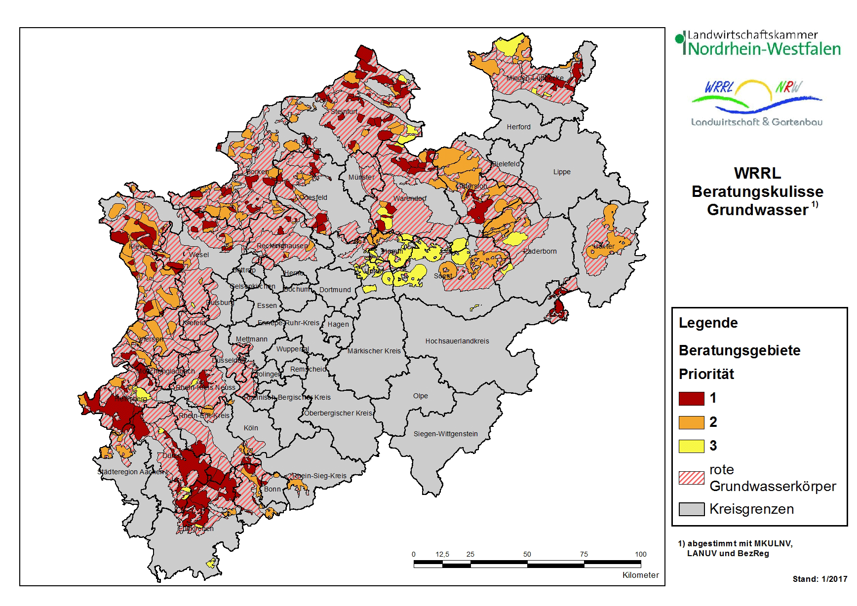 Der räumliche Schwerpunkt der Beratung liegt in den Gebieten, in denen ein besonderer Handlungsbedarf bezüglich Nitrat und Pflanzenschutzmitteln zum Schutz des Grundwassers gegeben ist. In diesen Bereichen wird die Beratung in drei Prioritätsstufen angeboten.
