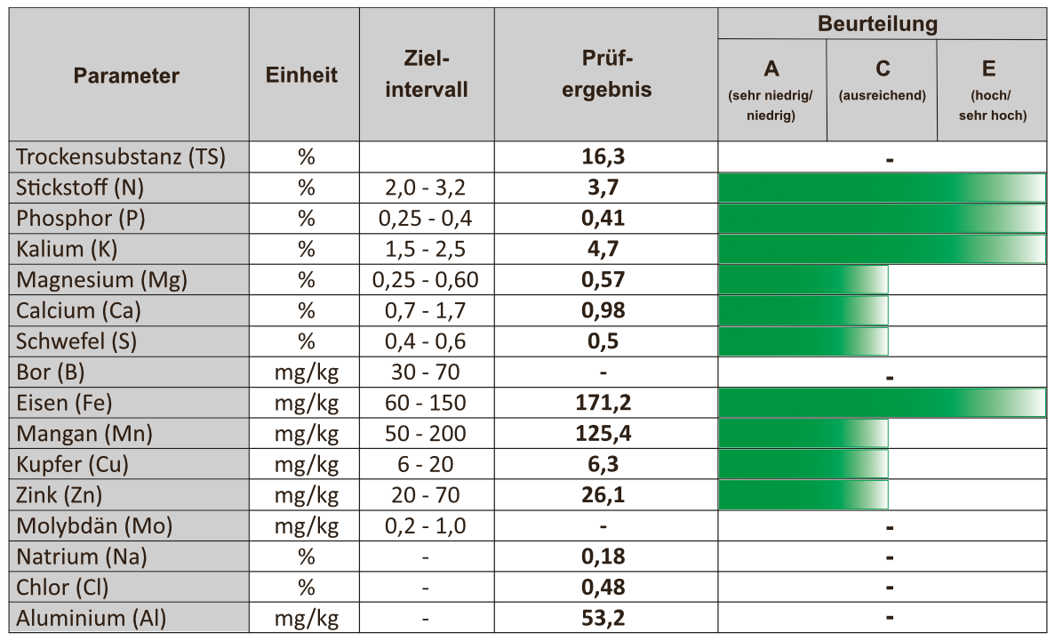 Für eine einfache und schnelle Einschätzung der Nährstoffversorgung in wachsenden Pflanzenbeständen werden die Prüfergebnisse von Pflanzenanalysen ab sofort mit Zielwerten verglichen und in Gehaltsklassen eingruppiert. Dieser Service ist für über 50 landwirtschaftliche und gärtnerische Kulturen verfügbar, sofern das Entwicklungsstadium und die Art des Pflanzenwachstums im Auftragsformular angegeben werden.