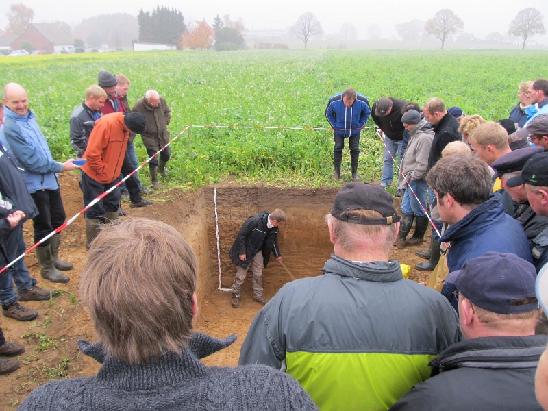 Erläuterungen an einem Bodenprofil unter Ölrettich im Rahmen eines Feldbeganges