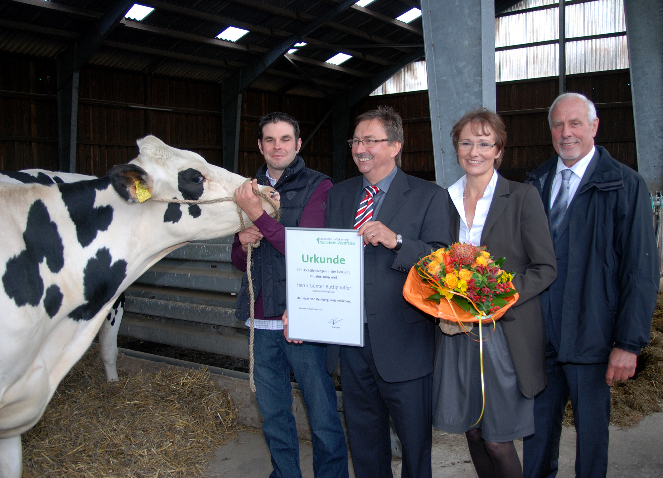 Landwirtschaftskammer-Präsident Johannes Frizen (rechts) überreichte den Hans von Bemberg-Preis 2009 an Günter Buttighoffer (3. von rechts). Seine Ehefrau freut sich mit, ebenso wie Mitarbeiter Sandy Multhaup (links) mit der Kuh Qualle.