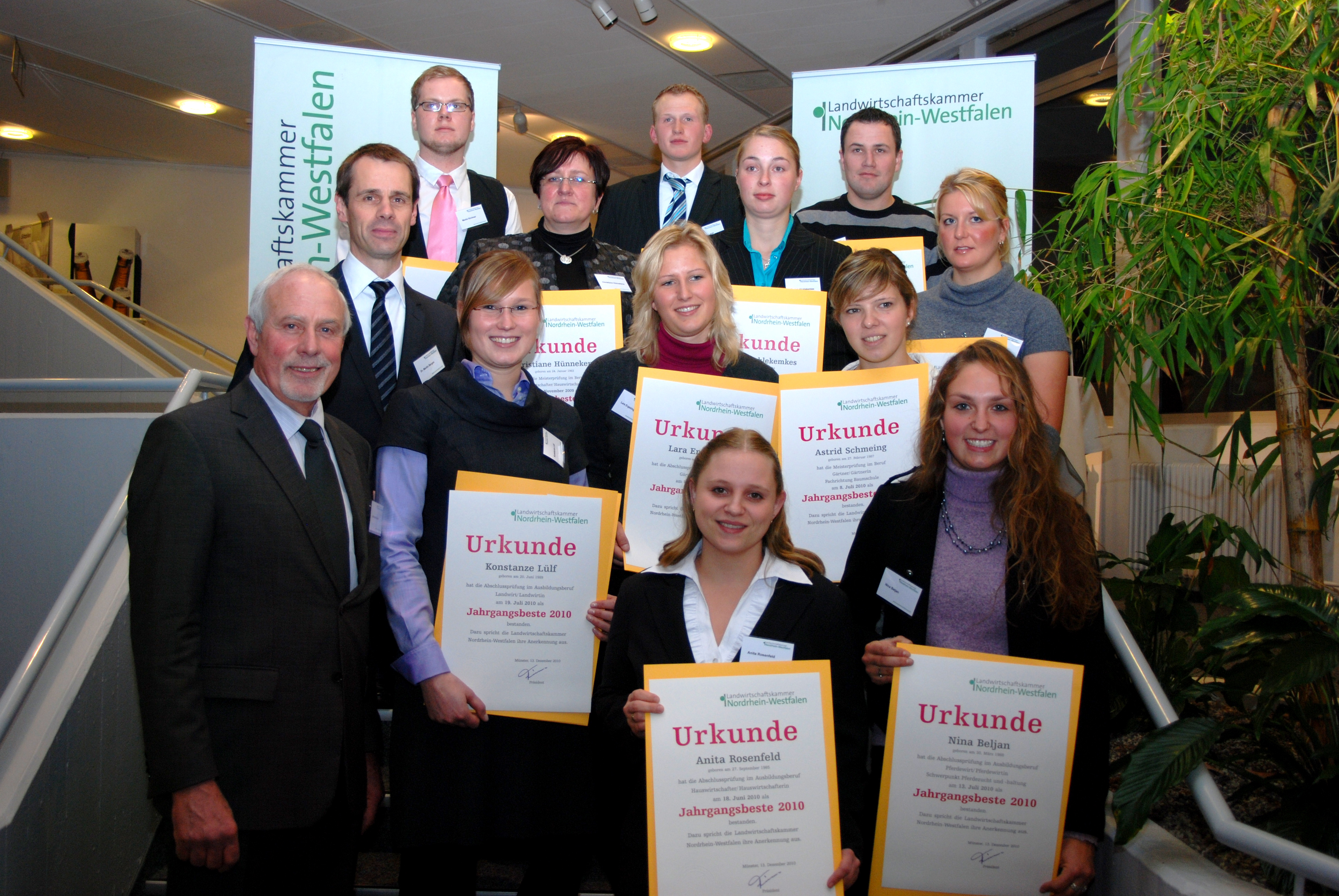 Die Landwirtschaftskammer Nordrhein-Westfalen hat erneut Nachwuchsförderpreise gestiftet, mit denen die jeweils besten Absolventinnen und Absolventen der Abschlussprüfungen in den grünen Berufen, der Meisterprüfungen sowie der Fachschulen geehrt wurden. Präsident Johannes Frizen und Kammerdirektor Dr. Martin Berges überreichten die Förderpreise, die mit einer Urkunde und einem Buchgeschenk verbunden sind, am 13. Dezember während der Hauptversammlung der Landwirtschaftskammer in Bad Sassendorf im Kreis Soest. Die Landwirtschaftskammer betreut zurzeit mehr als 10 000 Auszubildende und mehr als 800 Studierende in den Fachschulen für Landwirtschaft und Gartenbau.