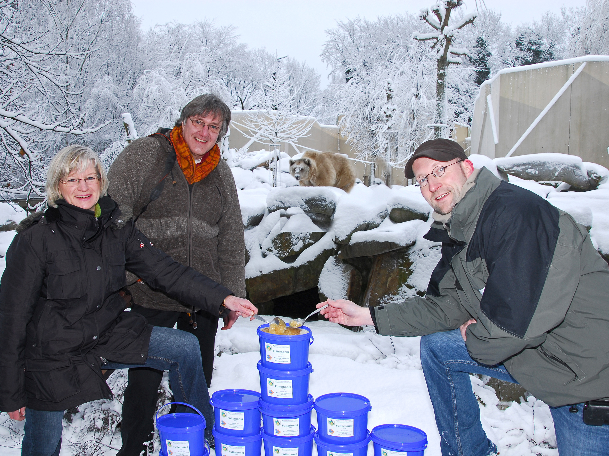 150 kg Honig spendeten die Imker der Stadt Münster und die Landwirtschaftskammer Nordrhein-Westfalen am Freitag vergangener Woche dem Allwetterzoo in Münster für die Fütterung der Bären und auch als Leckerei für viele Affenarten. Diese Honigspende freut nicht nur die Bären, sondern ist auch Gesundheitsschutz für die heimischen Bienen. Früher gab es für die Bären und Affen billigen Importhonig. Diesen Honig fanden auch die Bienen der Münsteraner Imker und infizierten sich mit der Amerikanischen Faulbrut, einer Bienenseuche, die in den vergangenen Jahren große Schäden unter den Bienen verursacht hat. Auch die Bienen des Bieneninstitutes der Landwirtschaftskammer mit 150 Bienenvölkern waren betroffen.