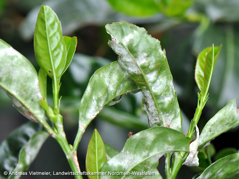Der Kirschlorbeer wurde in den vergangenen Jahren vermehrt vom Echten Mehltau - Podosphaera tridactyla - befallen. Wie der Pflanzenschutzdienst der Landwirtschaftskammer Nordrhein-Westfalen mitteilt, zeigt sich der Befall vornehmlich an den jüngeren Blättern, die zunächst an den Rückseiten von einem weißen, mehlartigen Sporenbelag bedeckt sind. Bei stärkerem Befall ist der weiße Belag später oftmals auch an den Blattoberseiten zu finden.