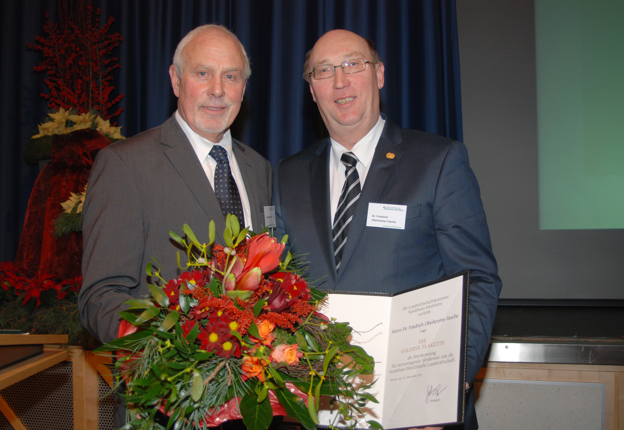 Für seine herausragenden Verdienste um die Landwirtschaft in Nordrhein-Westfalen ist der langjährige Kreislandwirt von Lippe, Dr. Friedrich Oberkrome-Tasche aus Lage im Kreis Lippe, mit der Goldenen Plakette der Landwirtschaftskammer Nordrhein-Westfalen ausgezeichnet worden. Kammerpräsident Johannes Frizen verlieh die Auszeichnung am 12. Dezember im Rahmen der Hauptversammlung in Bad Sassendorf im Kreis Soest.