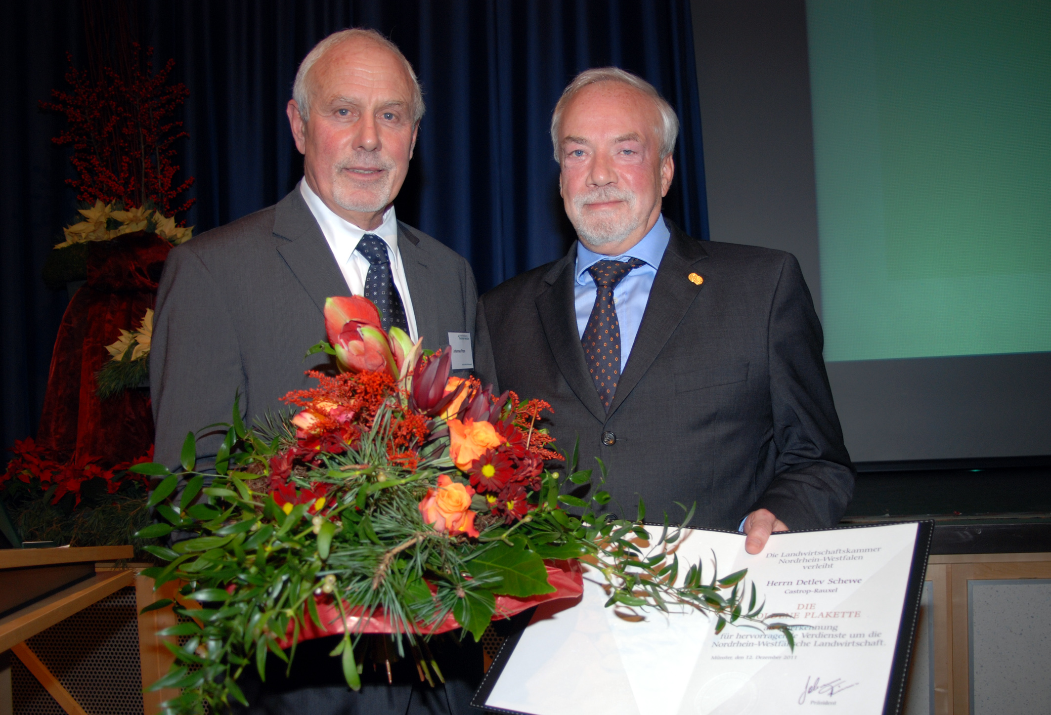 Für seine herausragenden Verdienste um die Landwirtschaft in Nordrhein-Westfalen ist Detlev Schewe aus Castrop-Rauxel im Kreis Recklinghausen mit der Goldenen Plakette der Landwirtschaftskammer Nordrhein-Westfalen ausgezeichnet worden. Kammerpräsident Johannes Frizen verlieh die Auszeichnung am 12. Dezember im Rahmen der Hauptversammlung in Bad Sassendorf im Kreis Soest.