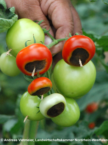 Tomatenfrüchte weisen in manchen Jahren graubraune bis braunschwarze Verfärbungen im Bereich der Blütenansatzstelle auf. Häufig sind die Flecken leicht eingesunken und teilweise verhärtet. Die Ursache für die Erscheinung ist nach Angaben des Pflanzenschutzdienstes eine Unterversorgung der Früchte mit dem Pflanzennährstoff Calcium.