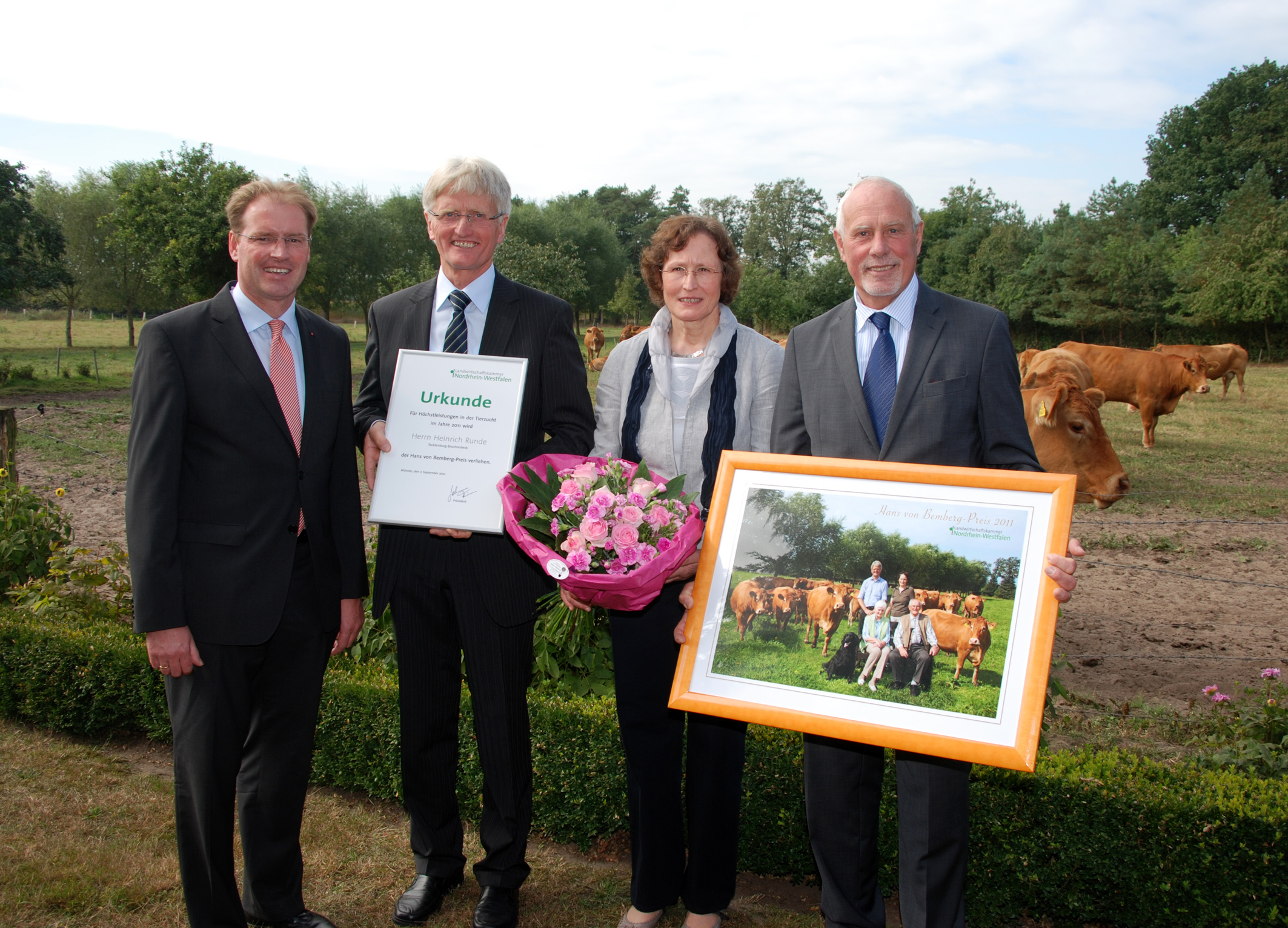 Der Hans von Bemberg-Preis für die beste tierzüchterische Leistung des Jahres 2011 geht an Heinrich Runde aus Tecklenburg-Brochterbeck im Kreis Steinfurt. Wie der Präsident der Landwirtschaftskammer Nordrhein-Westfalen, Johannes Frizen, anlässlich der Auszeichnung betonte, hat sich Heinrich Runde mit großem Engagement für die Zucht der Fleischrinder der Rasse Limousin eingesetzt.
