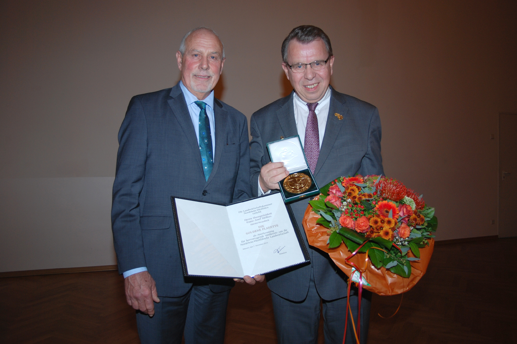 Hohe Auszeichnung für den ehemaligen Präsidenten des Westfälisch-Lippischen Landwirtschaftsverbandes (WLV) und jetzigen Ehrenpräsidenten, Franz-Josef Möllers aus Hörstel-Riesenbeck im Kreis Steinfurt: Der Präsident der Landwirtschaftskammer Nordrhein-Westfalen, Johannes Frizen, überreichte ihm am Mittwoch, 7. November, die Goldene Plakette der Landwirtschaftskammer.