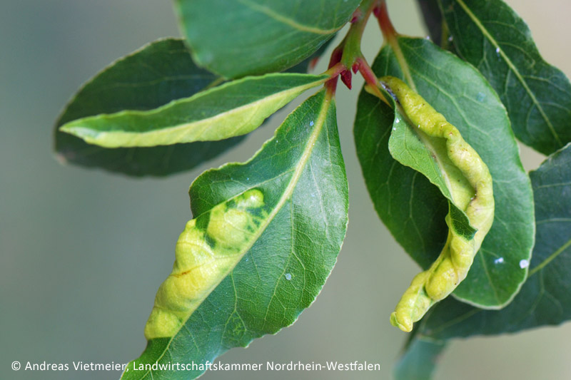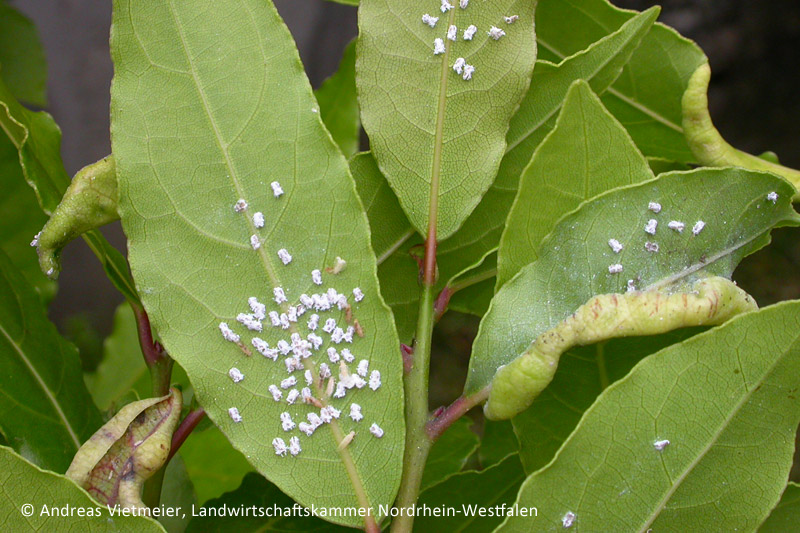 An Lorbeer ist zurzeit Befall mit dem Lorbeerblattfloh - Trioza alacris - zu beobachten. Wie der Pflanzenschutzdienst der Landwirtschaftskammer Nordrhein-Westfalen mitteilt, rollen sich die jüngeren Blätter des Lorbeers durch einen Befall nach unten ein und sind auffallend deformiert. Betroffene Stellen verfärben sich zusätzlich leicht gelblich. Bei fortschreitendem Befall sterben die geschädigten Blattbereiche ab und trocknen ein. In den zusammengerollten Blättern sowie an den Blattunterseiten sind zudem zum Teil die mit weißer Wachswolle bedeckten Larven sowie die geflügelten, gelblich-weißen Stadien des Blattflohs nachweisbar.