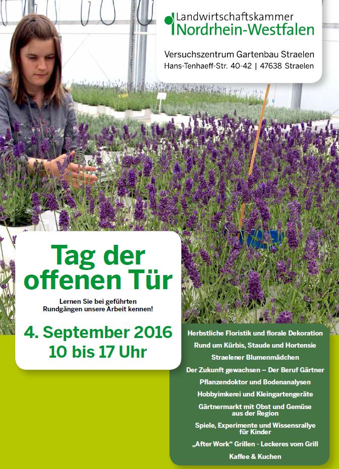 Vielfältige und interessante Themen für Erwerbs- und Hobbygärtner bietet das Versuchszentrum Gartenbau Straelen der Landwirtschaftskammer Nordrhein-Westfalen am Tag der offenen Tür am Sonntag, 4. September, an. Von 10 bis 17 Uhr sind die Tore der Gewächshausanlagen in der Hans-Tenhaeff-Straße 40 bis 42 geöffnet. Das Straelener Blumenmädchen Steffi Berghs-Trienekens empfängt die Besucher mit einem Blumengruß.