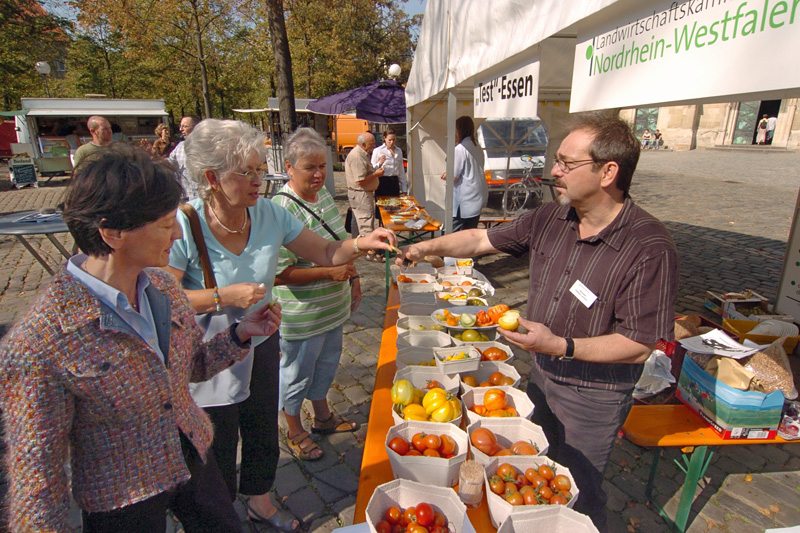 Bereits seit 16 Jahren veranstalten einmal jährlich Anfang September die Landwirtschaftskammer Nordrhein-Westfalen und die Öko-Marktbeschicker im Rahmen der Aktionstage Ökologischer Landbau NRW ein Testessen auf dem Domplatz in Münster. Angeboten wurden verschiedene Sorten an Tomaten, Käse und Kartoffeln. 400 Tester prüften, was die Lieblingssorte ist.