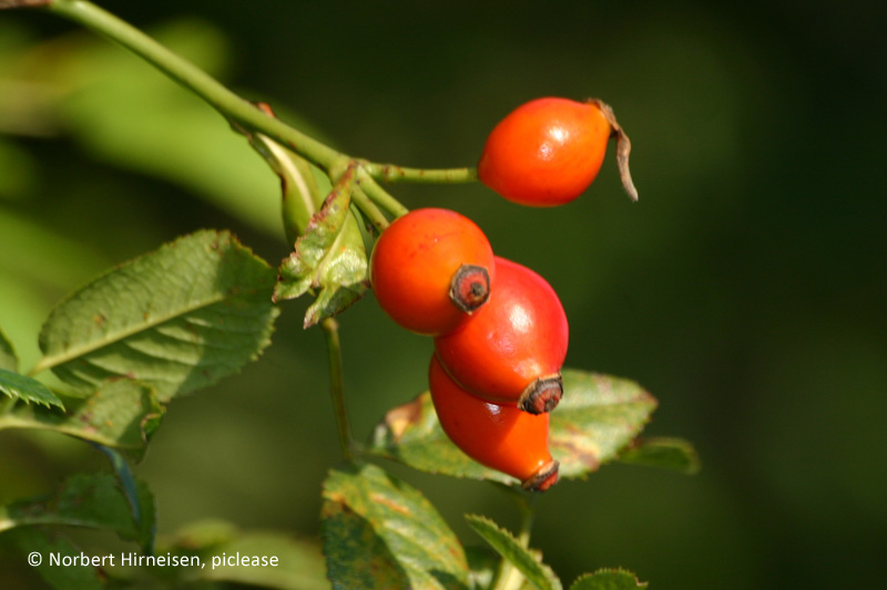 Viele Wildrosen tragen im Herbst leuchtend rote Hagebutten, die manchmal bis in den Winter hinein am Strauch bleiben. Die Form dieser Früchte variiert stark von kleinen, schlanken Hagebutten, wie denen der Hundsrose (Rosa canina) bis hin zu den flachkugeligen Früchten der Kartoffelrose (Rosa rugosa). Manche Wildrosen haben essbare Hagebutten, die sich durch einen hohen Vitamin-C-Gehalt auszeichnen, bekannt als Tee oder Marmelade. Sehr gesund sind auch die schwarzen Früchte des Holunders, die gerne für vitaminreiche Säfte verwendet werden.