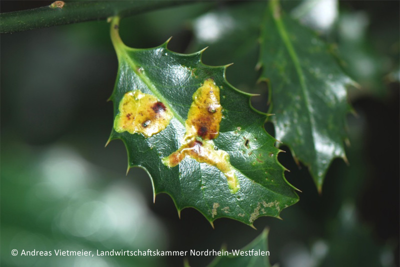 Bei einem Befall mit der Ilexminierfliege (Phytomyza ilicis) entstehen an den Blättern der Stechpalme (Ilex aquifolium und andere Arten) im Innern der Blätter geschlängelte, zuweilen auch flächige Fraßgänge. Wie der Pflanzenschutzdienst der Landwirtschaftskammer Nordrhein-Westfalen mitteilt, werden die Fraßgänge durch die Larven der Ilexminierfliege verursacht.