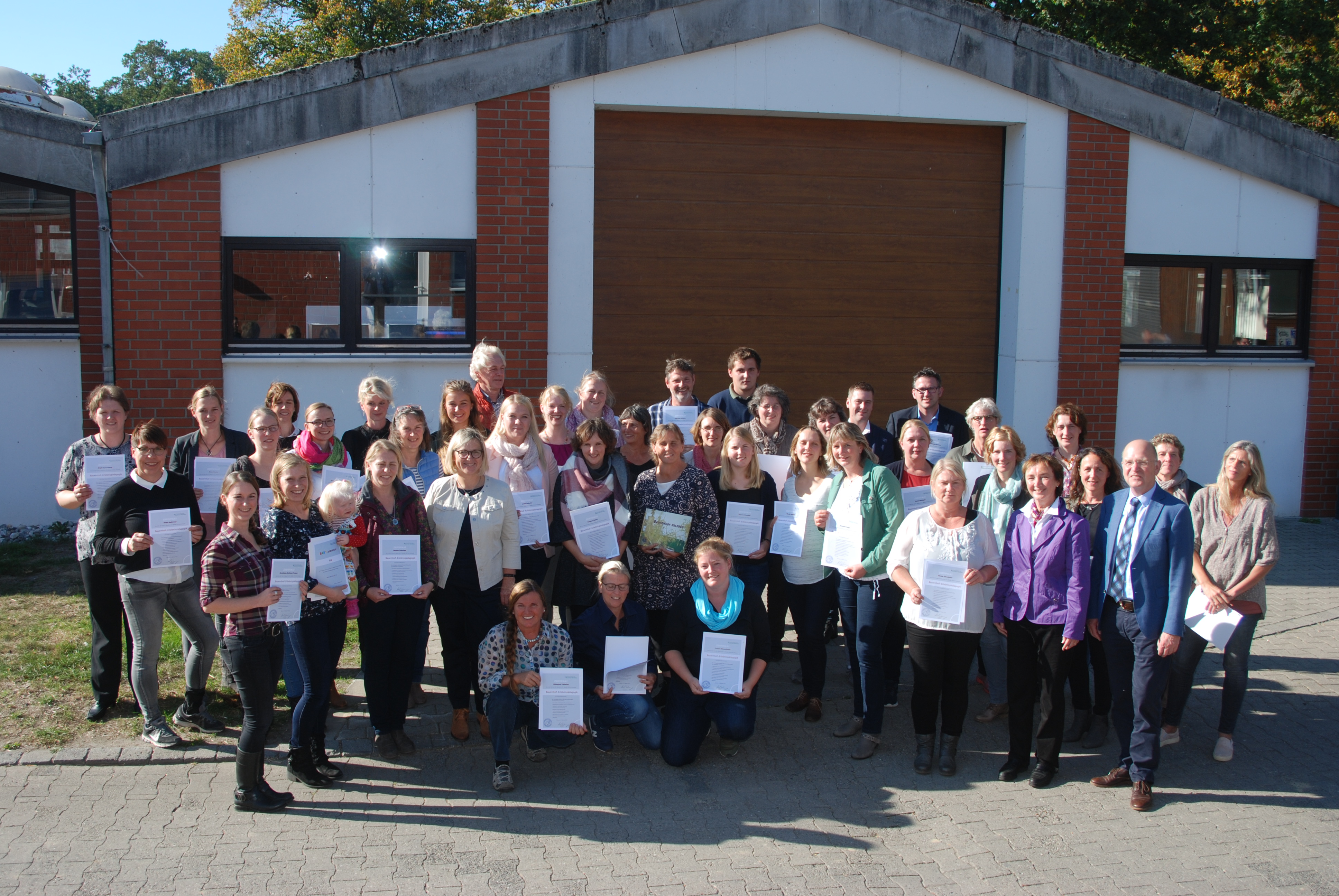 Landwirtschaft mit Herz und Hand praxisnah vermitteln – das haben sich die Bauernhof-Erlebnispädagogen auf ihre Fahnen geschrieben, die jetzt erfolgreich den Lehrgang für Bauernhof-Erlebnispädagogik bei der Landwirtschaftskammer Nordrhein-Westfalen absolviert haben. Kammerpräsident Karl Werring und die Vizepräsidentin des Westfälisch-Lippischen Landfrauenverbandes (WLLV), Petra Bentkämper, überreichten am 10. Oktober 2018 im Versuchs- und Bildungszentrum Haus Düsse der Landwirtschaftskammer Nordrhein-Westfalen im Kreis Soest, die Abschlusszertifikate an die erfolgreichen 40 Teilnehmerinnen und Teilnehmer, wovon 21 aus Westfalen-Lippe und 19 aus dem Rheinland kommen.