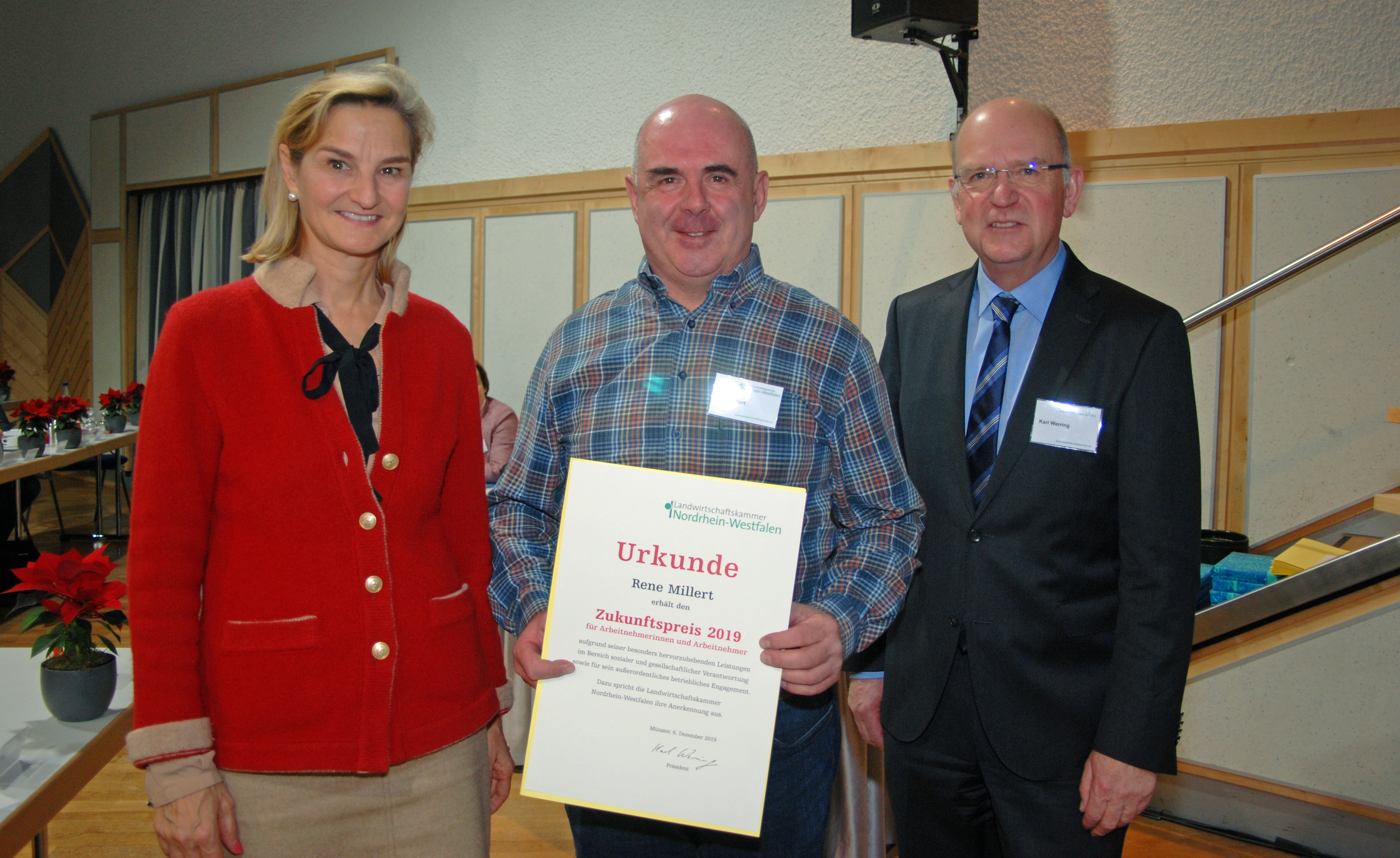 Der Zukunftspreis der Landwirtschaftskammer Nordrhein-Westfalen für Arbeitnehmerinnen und Arbeitnehmer in den Grünen Berufen geht in diesem Jahr an Rene Millert aus Borghorst-Dumte im Kreis Steinfurt. Vorgeschlagen hat ihn sein Arbeitgeber Josef Große Kleimann aus Borghorst. Den Preis überreichte ihm Kammerpräsident Karl Werring während der Hauptversammlung der Landwirtschaftskammer am Freitag, 6. Dezember, in Bad Sassendorf im Kreis Soest. Die Ehrung besteht aus einer Urkunde und einem Geldpreis.