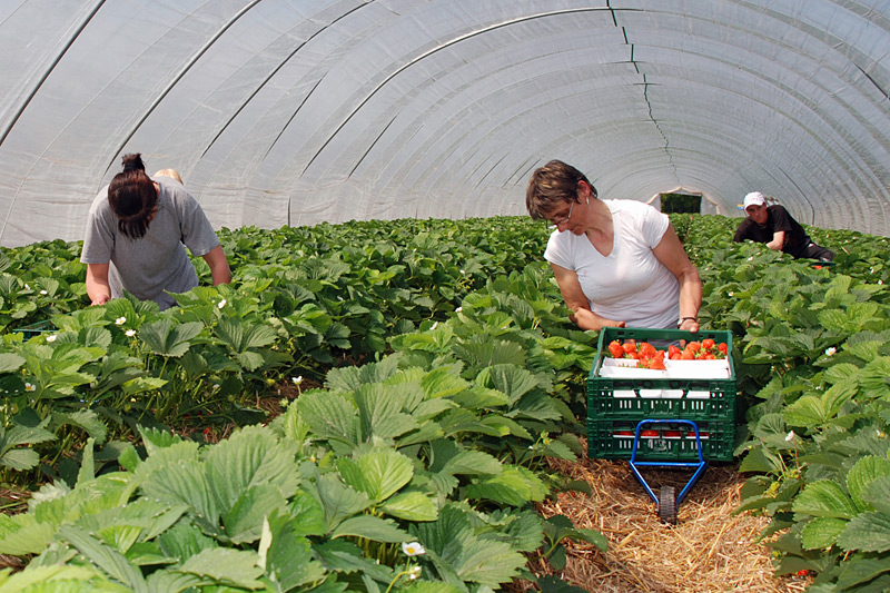 Bei den Erdbeeranbauflächen in Deutschland steht NRW nach Niedersachsen an zweiter Stelle. In NRW wuchsen 2020 auf rund 2 200 ha Erdbeeren, die meisten davon, rund 1 800 ha, ungeschützt im Freiland und etwa 370 ha geschützt unter einer Abdeckung in einem Tunnel oder Gewächshaus. Im Frühjahr wird es dort durch die Sonne schnell warm und so können die Pflanzen bei ca. 24°C gut gedeihen. Außerdem sind die Pflanzen dabei vor Frost, Hagel und zu viel Regen geschützt. Die ersten Erdbeeren der Saison kommen aus dem geschützten Anbau, je nach Witterung gibt es ab Mitte oder Ende Mai Erdbeeren aus dem Freiland.