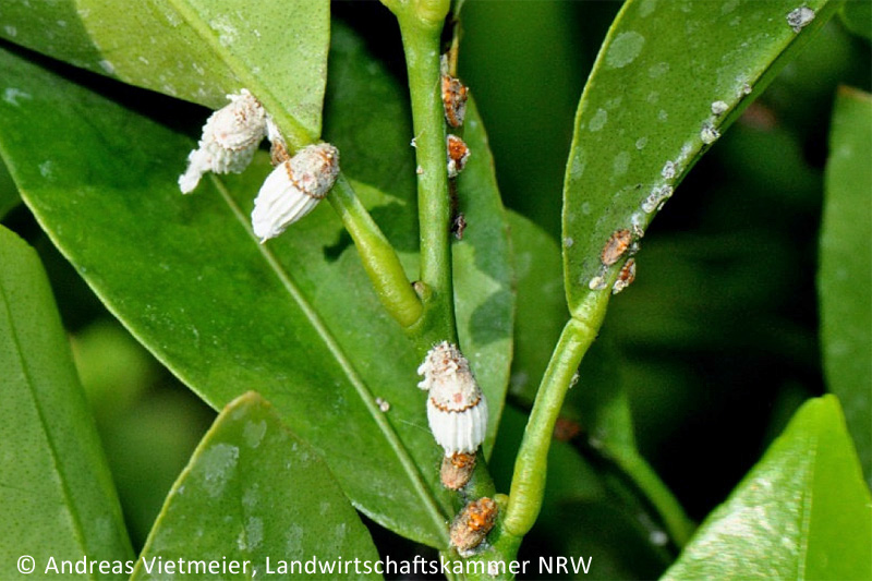 Die Australische Wollschildlaus (Icerya purchasi) ist ein auffälliger Schädling, der gelegentlich an Zitrusbäumchen auftritt. Die Schildlaus wird einschließlich ihres weißen, länglich ovalen Eisacks bis zu einem Zentimeter lang, berichtet der Pflanzenschutzdienst der Landwirtschaftskammer Nordrhein-Westfalen. Außer an Zitrus-Arten kommt sie manchmal auch an Klebsame, Geißklee, Mimose, Rosmarin und Buchsbaum vor.