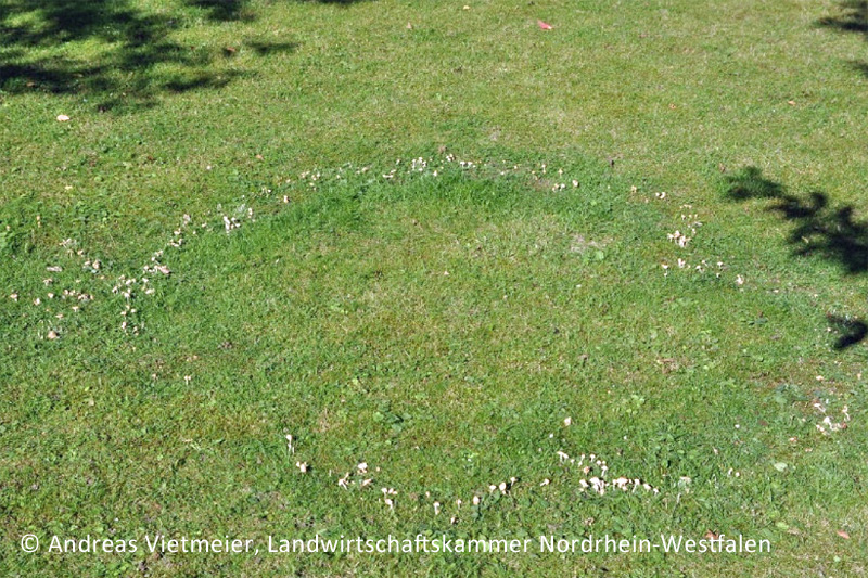 Wenn im Rasen kreisförmig angeordnete Hutpilze auftreten, spricht man von Hexenringen. Verschiedene Hut- und Ständerpilze sind für dieses Phänomen verantwortlich, teilt der Pflanzenschutzdienst der Landwirtschaftskammer NRW mit. Die vorkommenden Pilze sind typische Bewohner der natürlichen Bodenfauna. Viele dieser Pilzarten leben saprophytisch, ernähren sich also von totem Material, und zersetzen das organische Material im Boden, wie zum Beispiel abgestorbene Wurzeln oder Baumreste.