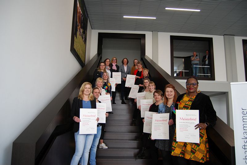 Für 14 Meisterinnen und Meister der Hauswirtschaft hat das Jahr 2023 mit der bestandenen Meisterprüfung mit einem tollen beruflichen Erfolg begonnen. Die Absolventinnen und Absolventen erhielten ihre Urkunde am Freitag, den 3. März 2023, bei der Landwirtschaftskammer Nordrhein-Westfalen. 13 Frauen und ein Mann haben bereits im Jahr 2020 mit der Vorbereitung auf die Meisterprüfung begonnen, diese im Jahr 2021 berufsbegleitend absolviert und im Januar 2023 erfolgreich abgeschlossen. Nach vielen Monaten des Lernens und sechs anspruchsvollen praktischen und schriftlichen Prüfungen in den Prüfungsbereichen Hauswirtschaftliche Versorgungs- und Betreuungsleistung, Betriebs- und Unternehmensführung, Berufsausbildung und Mitarbeiterführung können die zukünftigen Führungskräfte und Ausbildenden der Hauswirtschaft nun ihren Meisterbrief in den Händen halten.