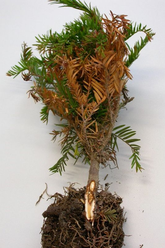 Eiben werden sehr häufig von der Wurzel- und Stammfäule (Phytophthora cinnamomi) befallen. Bei der Erkrankung handelt es sich um eine Pilzkrankheit, die an den Wurzeln und am Stammgrund der Pflanze auftritt, teilt der Pflanzenschutzdienst der Landwirtschaftskammer NRW mit. Ein Befall führt dazu, dass das Pflanzengewebe der Wurzeln und des Stammgrundes zum Teil abstirbt und die Pflanze dadurch kaum mehr Wasser aufnehmen kann. Die Nadeln der Eiben verfärben sich in der Folge häufig gelb oder braun und vertrocknen. Schließlich sterben die Eiben nach einiger Zeit oft sogar ganz ab. Betroffen sind besonders Eiben, die als Hecken angepflanzt wurden.