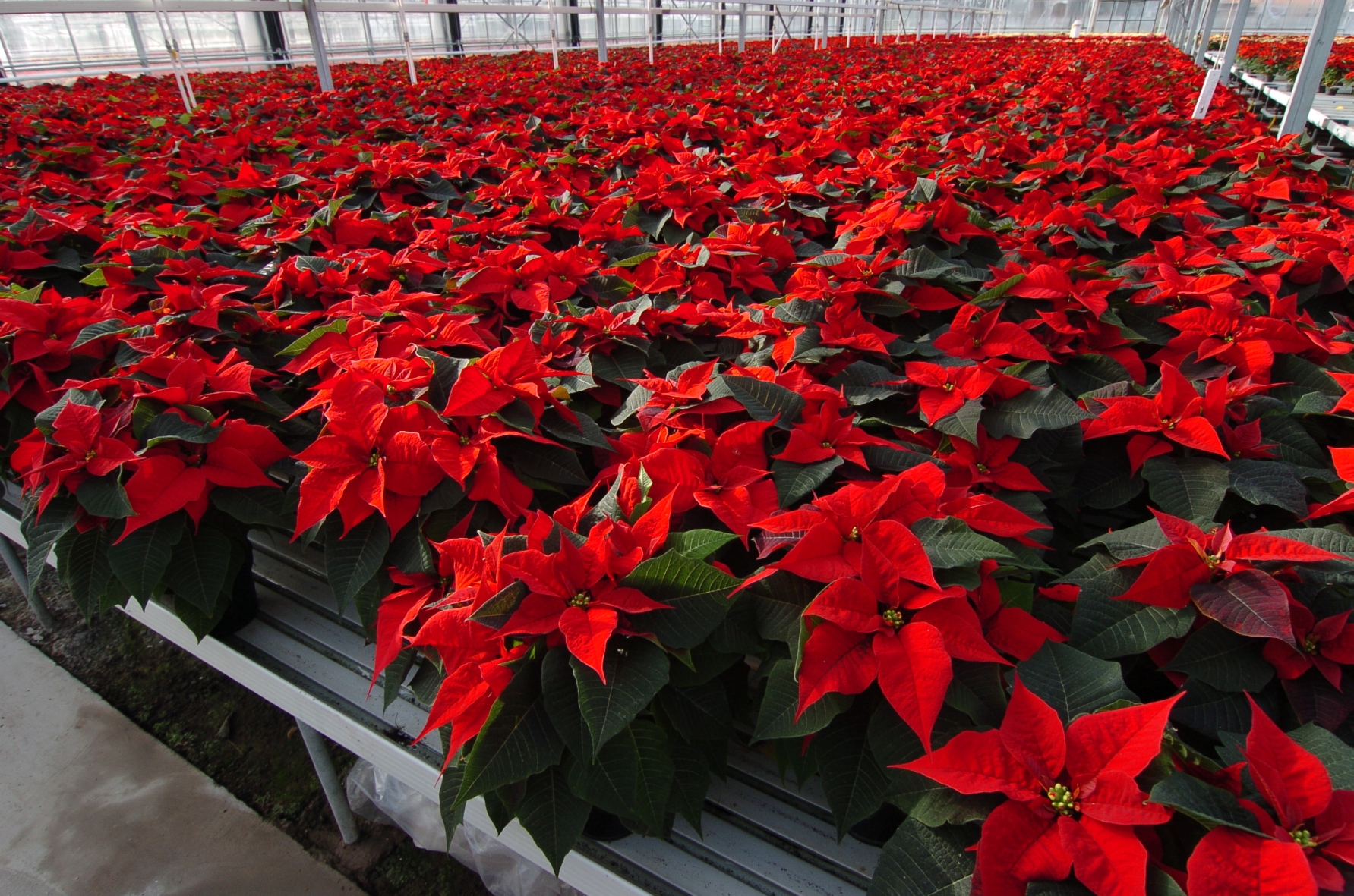 Verkaufsfertige Weihnachtssterne im Gewächshaus