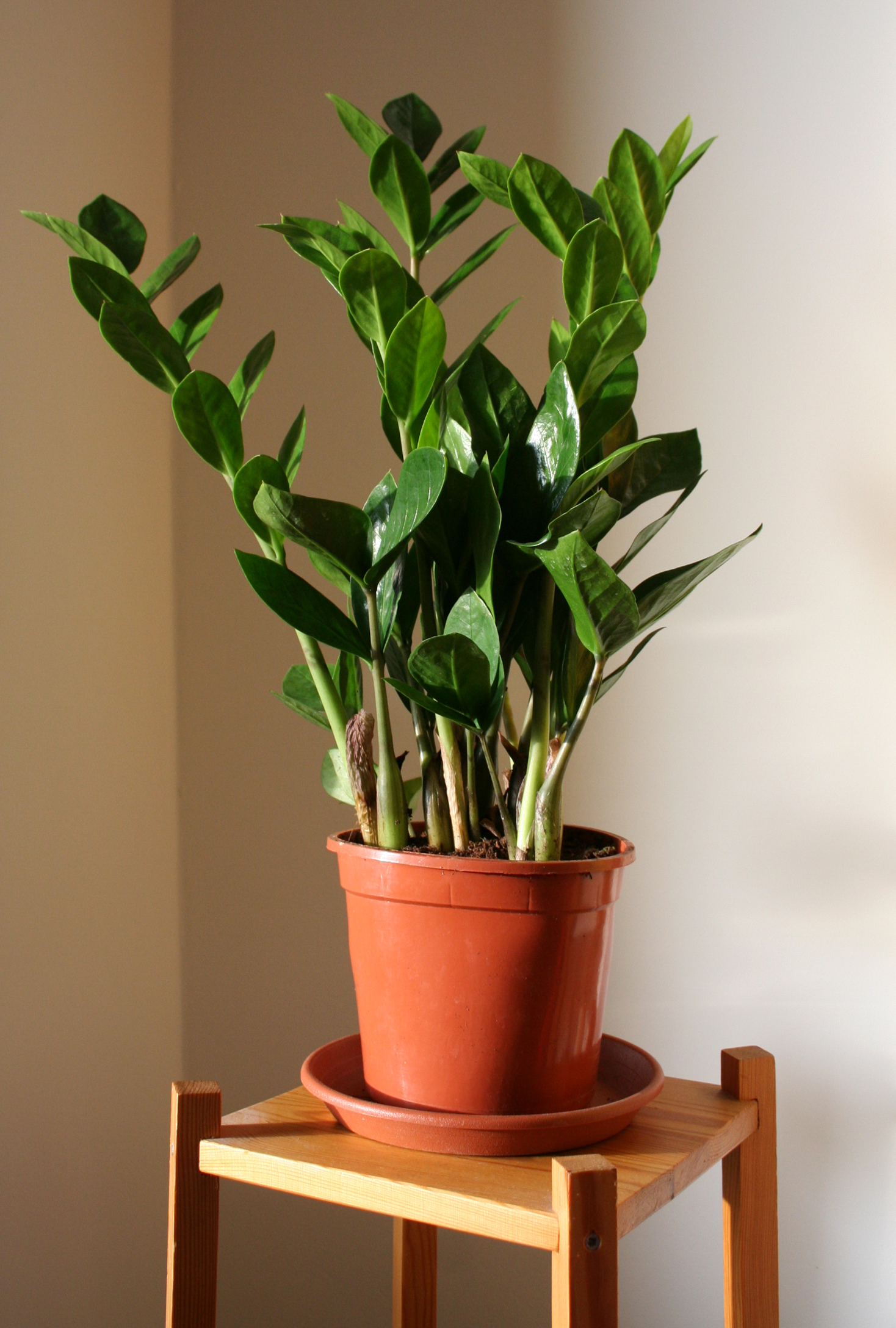 Zamioculcas zamiifolia, Familie Araceae, kommt mit wenig Licht aus.