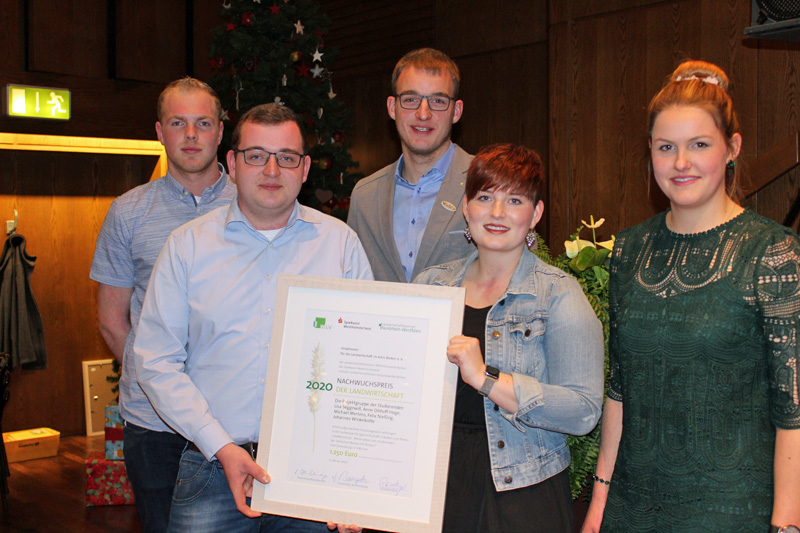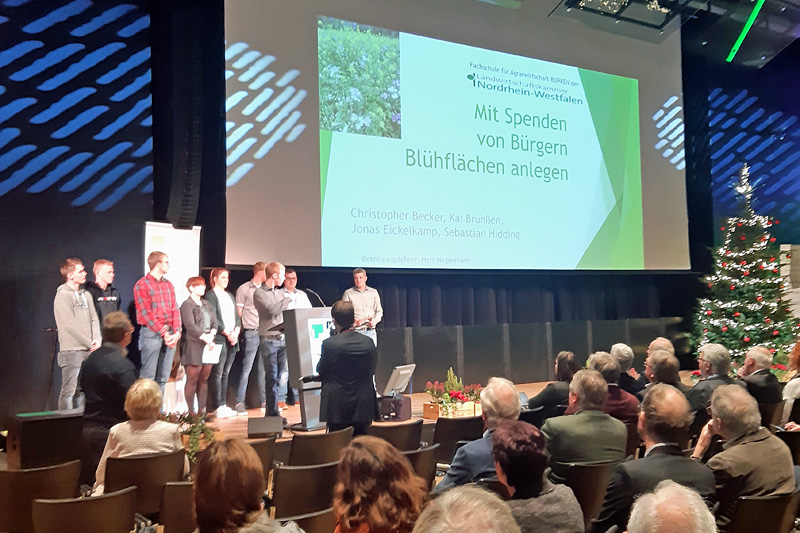 Natürlich muss man die Probleme der Agrarwirtschaft und der Agrarpolitik artikulieren , die Studierenden der Fachschule taten das nicht, sie zeigten unter dem Titel “Landwirte ein Problem -oder Teil der Lösung ?“, welche Erfahrungen sie bei konkreten Projekten zum Insektenschutz gemeinsam mit Bürgern bzw. Kindern gesammelt haben. Während das Team Lisa Seggewiß, Johannes Winkelkotte, Felix Nießing, Anne Olthoff Hoge und Michael Mertens in einer Woche 4 Insektenhotels mittels Upcyceln, davon 2 mit Kindern aus verschiedenen Kindergärten, einschließlich Blühflächen errichteten- also den Insekten ein Zuhause gaben, kümmerten sich das Team Kai Brunßen, Christopher Becker, Sebastian Hidding und Jonas Eickelkamp um die Nahrung der Insekten. Sie legten Blühflächen auf den Nutzflächen der Familie Brunßen in der Gemeinde Drevenack an und bewiesen, dass Crowdfunding mittels sozialer Medien gut funktionierte und vermittelten, wie man die Aktion „Blühflächenpaten gesucht“ gut durchdacht und nachvollziehbar angeht. Die Botschaft „Wir wollen nicht NUR reden -sondern handeln“ wurde von den Zuhörern begeistert aufgenommen. Die vielen Stunden der Übung für den Vortrag mit einer häufig verbessernden Kommunikationslehrerin haben sich gelohnt. Mit Freude, Emotionen vorgetragenen und fehlerfrei gesprochenen Referaten zeigten die Studierenden, dass sie den Vergleich mit geübten Rednern des Verbandes nicht scheuen müssen.