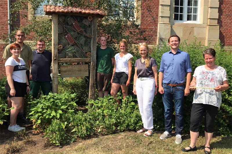 Einige Tage nachdem die Studierenden ihre Arbeit in der Fachschule dem Lehrerkollegium, interessierten Mitarbeitern der Kreisstelle und ausgewählten Gästen vorgestellt hatten, meldete sich Frau Kalfhues, Mitarbeiterin der Stadt Borken, und bekundete Interesse an einer Zusammenarbeit mit den Studierenden der Projektgruppe. Es sollte ein weiteres Insektenhotels direkt vor dem Borkener Rathaus aufgestellt werden. Hier waren im vergangenen Jahr bereits Blühstreifen zum Schutz der Insekten angelegt worden. Die Errichtung eines Insektenhotels sollte diese Idee abrunden.