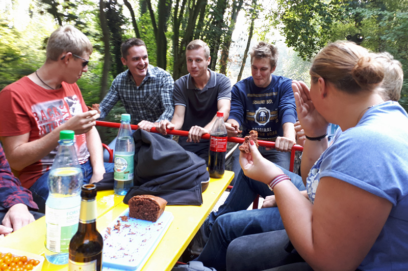Im Anschluss trafen sich am Draisinenbahnhof in Kleve, um mit mehreren Gruppendraisinen nach Kranenburg zu fahren. Während der Fahrt bestand ausreichend Gelegenheit sich zu stärken. Das Wetter spielt auch mit. Es war sonnig und wie schon im ganzen Jahr trocken. Vermutlich hätte sich aber niemand beschwert, wenn es in Strömen geregnet hätte.
