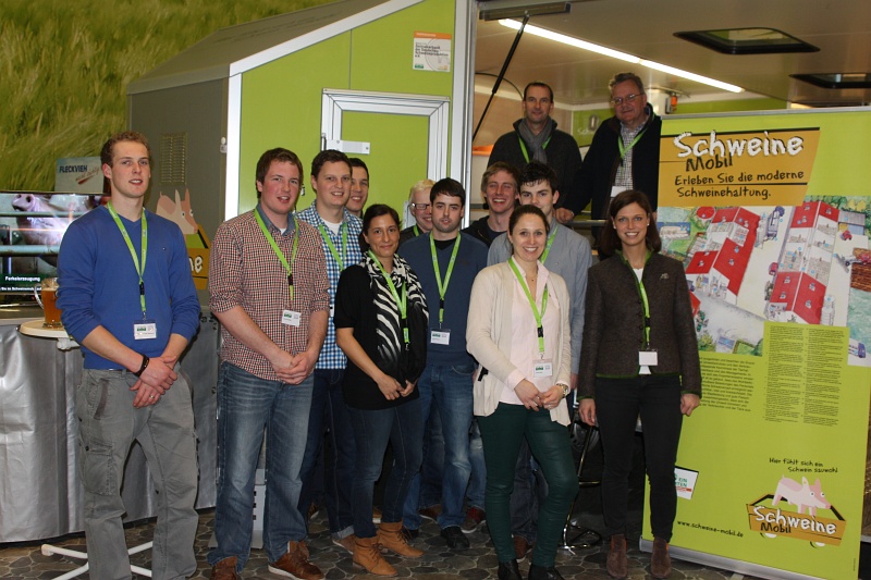 Öffentlichkeitsarbeit „für das Schwein“ leisteten Schüler der Fachschule für Agrarwirtschaft in Kleve zusammen mit den Mitarbeitern der Schweinevermarktung Rheinland (SVR) auf der Grünen Woche in Berlin. Sie betreuten für vier Tage das Schweinemobil im Rahmen des ErlebnisBauernhofes in Halle 3. Sarah Grandt als Lehrerin der Schüler hatte sich spontan bereit erklärt, mit ihren Schülern dort Öffentlichkeitsarbeit zu leisten. Gefördert wurde die Reise von der Volksbank und dem Verband landwirtschaftlicher Fachschulabsolventen. Das Schweinemobil ist eine auf einem PKW-Anhänger aufgebaute Schweinebucht mit Spaltenböden, Futterautomat, Deckenlüftung und Spielzeug verschiedener Art. Das Mobil wurde von den Besuchern durchaus gut frequentiert. Kontroverse Diskussionen über die Schweinhaltung gab es auch; mehr aber Fragen nach Alter der Ferkel, Futter etc. Unser Foto zeigt (v.l.n.r.): Philipp Weymanns, Patrik Janßen, Heiner Langels, Philipp Lamers, Maria Hocks (SVR), Oliver Klings, Lukas Wache, Peter Sleuwen, Sarah Grandt, Marcel Leurs, die SVR-Mitarbeiter Rainer Müller, Bernd Schiefer und Charlotte Meierkord.
