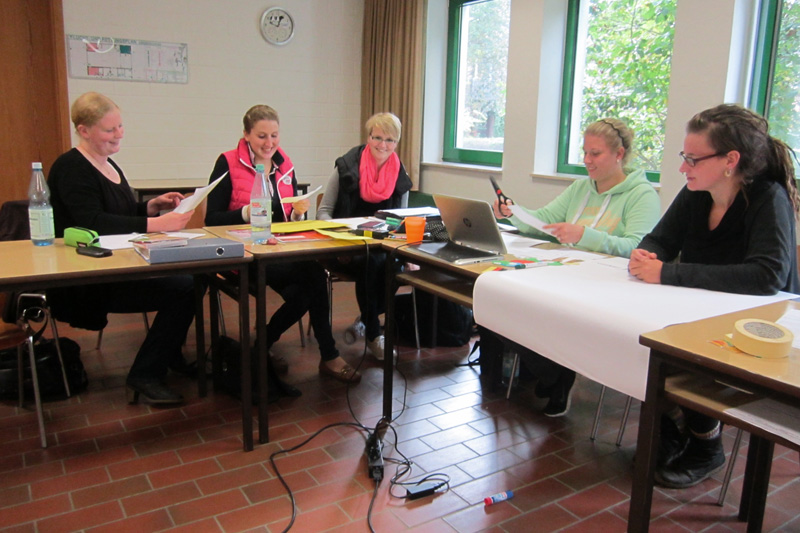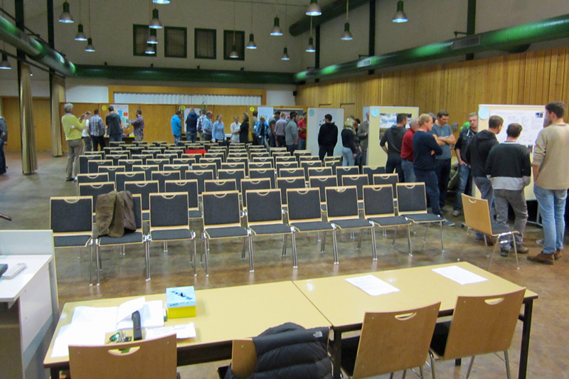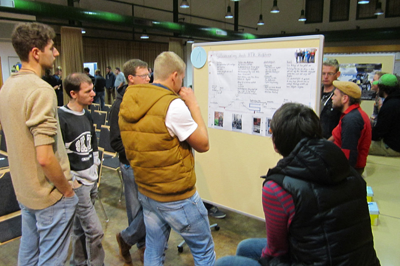 Der Gruppe „Kann Geflügelzucht nachhaltig sein?“ ging es vor allem um die Frage, wie man die männlichen Küken von Legehybriden nutzen, die gegenwärtig direkt nach dem Schlüpfen getötet werden. Verwendet man Zweinutzungshühner, so legen diese weniger und der Schlachtkörper ist auch nicht wirklich befriedigend. Alternativ können normale Legehybride genutzt werden und mit einem höheren Eierpreis wird das Hähnchen subventioniert. Mit einer Kombination von Landwirtschaft und Forstwirtschaft hat sich die Gruppe „Agroforst“ beschäftigt. Neben ökologischen und ökonomischen Faktoren wurden dabei auch soziale Fragen diskutiert, z. B. wie generationsübergreifend in so einer Bewirtschaftungsform gearbeitet werden kann.