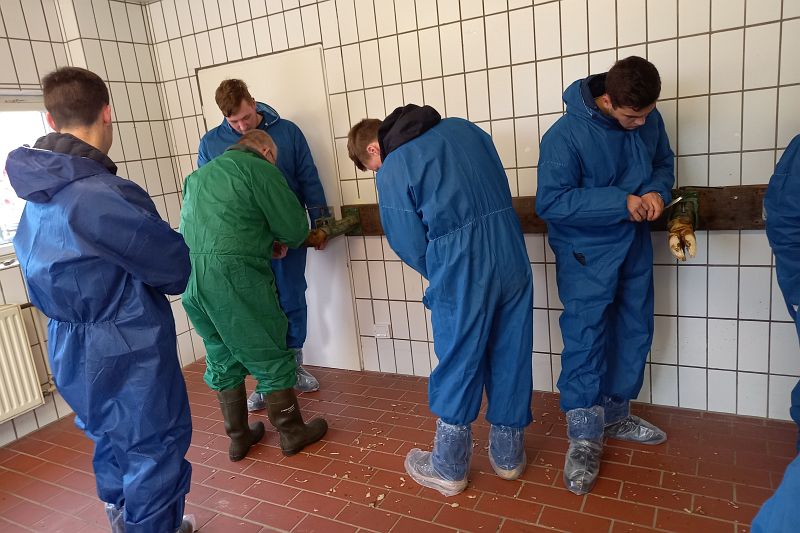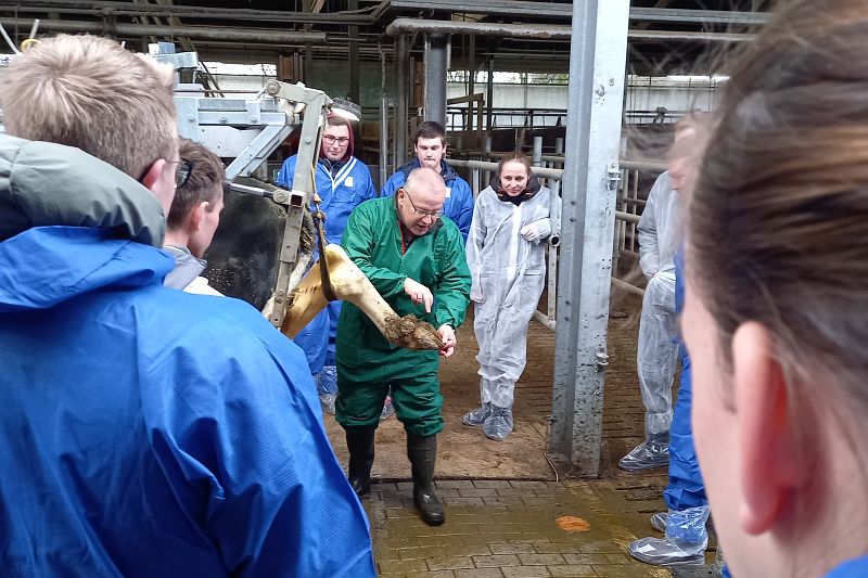 Dr. Peter Heimberg, der Leiter des Tiergesundheitsdienstes der Landwirtschaftskammer NRW, hat die Studierenden in Theorie und Praxis geschult. In dem Theorieblock folgten die Studierenden konzentriert den Ausführungen, die aufgrund der umfassenden Erkenntnisse des Tierarztes mit sehr viel Hintergrundwissen angereichert waren. Anschließend wurde in der Praxis am lebenden Tier und an Schlachthofklauen demonstriert und geübt.