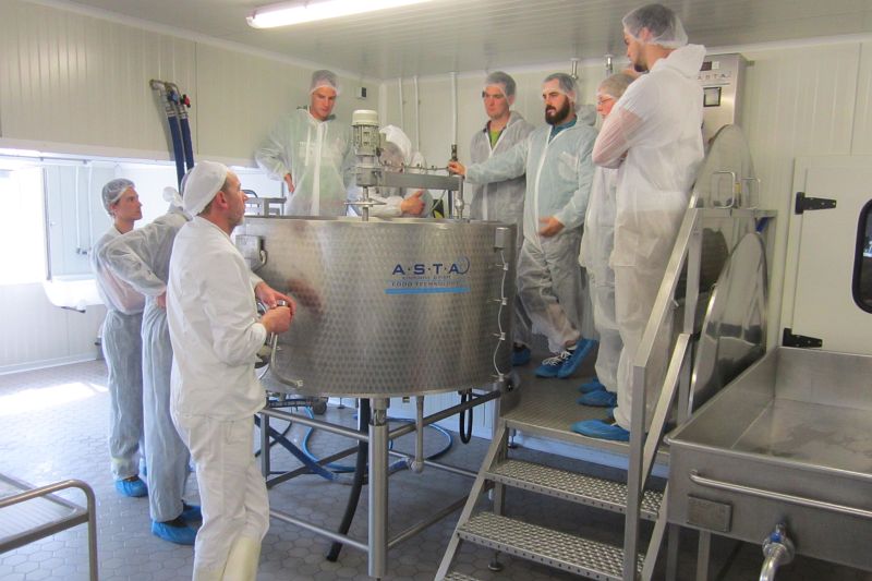 Am 14. und 15. April bestand in zwei Lerngruppen die Möglichkeit, die erworbenen theoretischen Kenntnisse in der Käseherstellung in die Praxis umzusetzen. Mit der Dingdener Heidemilch hat Familie Groß-Bölting ein regionales Produkt erschaffen. Auf dem Betrieb wird die Milch von Ziegen und Kühen verarbeitet. Eine Gruppe verarbeitete daher auch Kuhmilch, die andere Ziegenmilch. Die Studierenden lernten, dass man als KäserIn nur begrenzten Einfluss auf die Produktion hat und sich mehr als „Prozessbegleiter“ betrachten sollte.