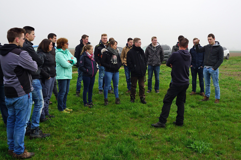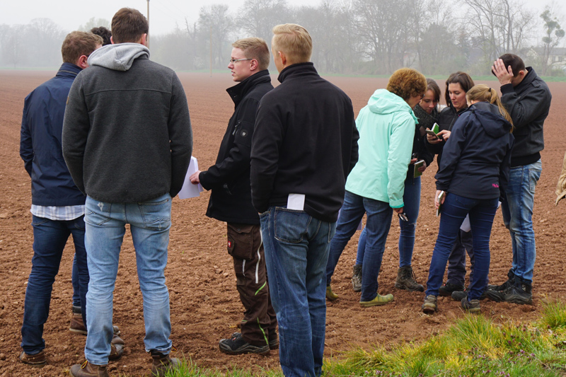 Weiter fuhr die Klasse zum Schülerbetrieb Radmacher nach Zülpich. Nach einer Betriebsbesichtigung ging es auf den Acker. Dort wurde in den blühenden Rapsflächen nach Schädlingen Ausschau gehalten und im Getreide nach Krankheiten gesucht. Zurück auf dem Betrieb gab es von der Familie noch eine kleine Stärkung.