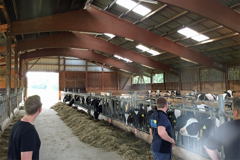 Nachmittags erreichten wir den Betrieb Busch in Radevormwald, der komplett von Familienarbeitskräften gestemmt wird. Sie bewirtschaften 106ha und halten rund 120 Kühe, die im Doppel 6er Fischgrätenmelkstand gemolken werden. 2009 wurde ein neuer Stall für Rinder und Trockensteher gebaut, an dem 2017 noch 20 Plätze für melkende Kühe angebaut wurden. Trotz des älteren Kuhstalls und vereinzelt ungünstiger Gegebenheit überzeugte der Betrieb mit optimalen Milchleistungen.