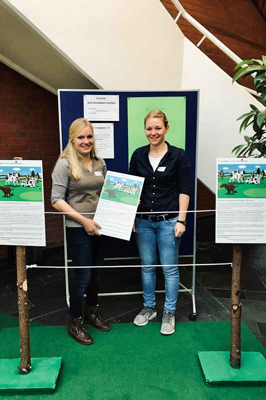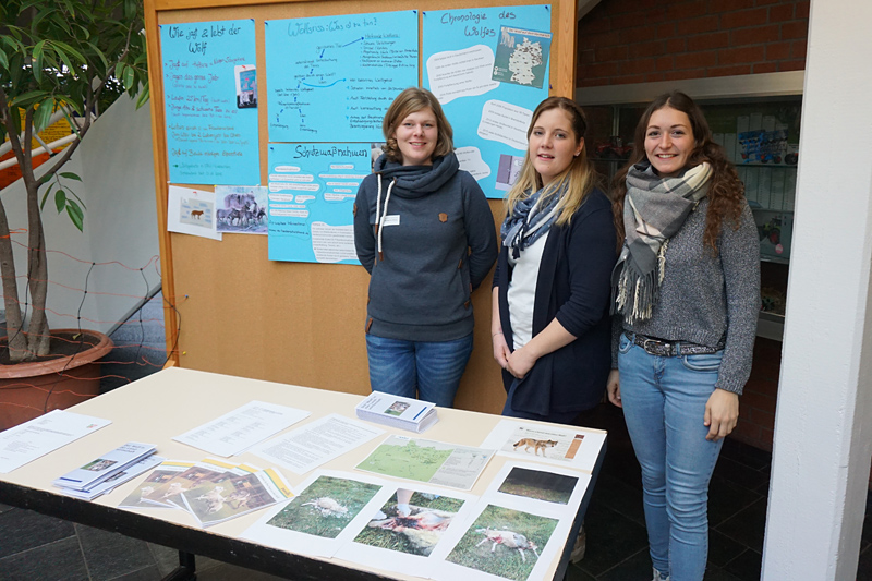 Im Foyer der Schule waren zahlreiche aufwändig gestaltete Informationsstände der Studierenden aufgebaut. Besonders spannend war dabei der Stand, der von drei Schülerinnen zum Thema Wolf in der Landwirtschaft präsentiert wurde, denn hier konnte sich der Landwirt über die Wolfsrückkehr und mögliche Schutzmaßnahmen auf dem Betrieb informieren. Neben verschiedenen Zaunmodellen konnten die Besucher auch alles über Herdenschutzhunde und –esel sowie das Vorgehen bei einem tatsächlichen Wolfsangriff auf Nutztiere in Erfahrung bringen.
