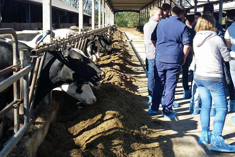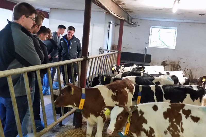 Am frühen Morgen trafen sich die Schüler mit zwei Lehrern auf dem Betrieb der Familie Büllesbach. Sie haben einen gemischten Betrieb. Dies bedeutet überwiegend Milchkühe, aber auch Ackerbau und Grünland. Im Jahr 2017 hat die Familie Büllesbach Ihren Stall vergrößert und einen neuen Liegebereich für die Kühe und einen neuen Melkstand an das Altgebäude angebaut. Sie haben auch Spaß an Zuchtbullen und ziehen dadurch einige Bullen im Jahr auf und verkaufen diese dann.