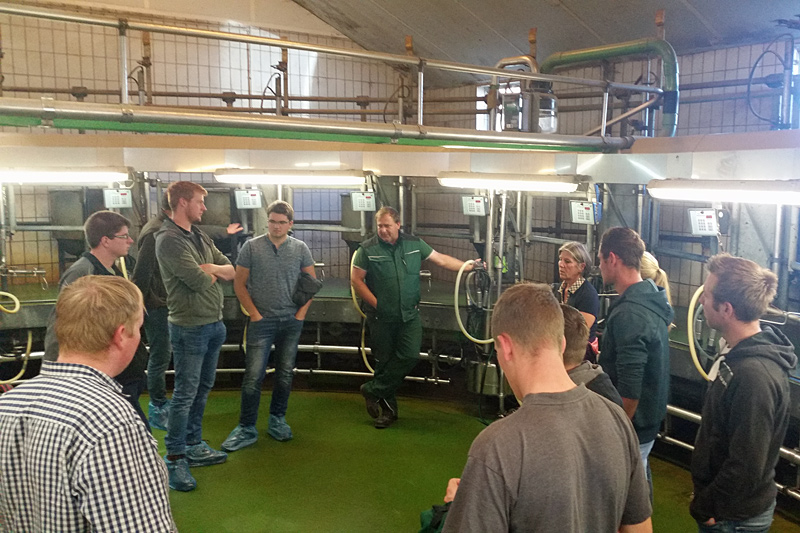 Im Anschluss stellte der Leiter der Hüsch Agrar GbR seinen Milchviehbetrieb detailliert vor. Dort werden 280 Kühe gemolken. Es gab viel auf dem Betrieb zu sehen. Von einem Melkkarussel bis hin zur Biogasanlage. Derzeit wird auf dem Betrieb noch ein neuer großer Abkalbebereich für die Kühe und ein neuer Kälberstall gebaut. Damit möchte Herr Hüsch den Kühen mehr Kuhkomfort bieten. Der Betrieb möchte seine Herdenleistung mit 11000 Kg Milch noch verbessern.