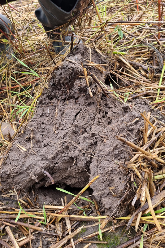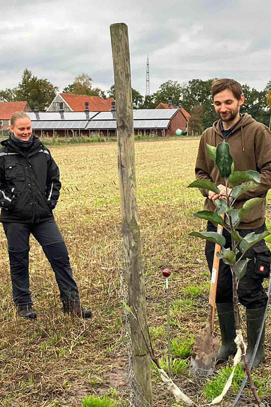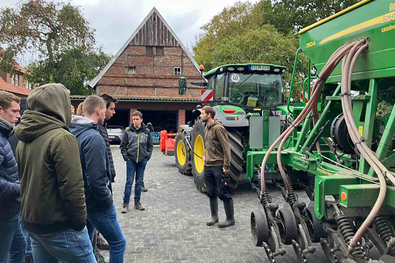 Im Anschluss an die Präsentationen konnten die Studierenden die Flächen und Anlagen auf dem Hof besichtigen. Beispielsweise wurde der erst vor kurzem angelegte Agroforst-Bereich mit jungen Apfelbäumen vorgestellt. Außerdem gab es eine Führung durch die Felder mit laufenden Direktsaat-Kulturen.