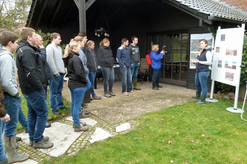 Stefanie Feldmann, Beraterin der Landwirtschaftskammer NRW führte am Montag, 13.03.2017, in die Thematik ein. Am Dienstag, 14.03. wurden die Leitbetriebe Biodiversität aufgesucht. Hier gaben die Landwirte Lothar Stumpenhorst und Christoph Tentrup-Beckstedde und die Kammerberaterin Caroline Flecken einen Überblick über die im Betrieb „Harberg KG“ in Neubeckum realisierten Maßnahmen zum Artenschutz. Zeitgleich wurden von anderen Fachschülergruppen die Leitbetriebe Ralp Uennigmann in Greven und Josef Lehmenkühler in Geseke besucht. Die Beratungsspezialistinnen der Landwirtschaftskammer, Elisabeth Verhaag und Stefanie Feldmann begleiteten diese Gruppen.