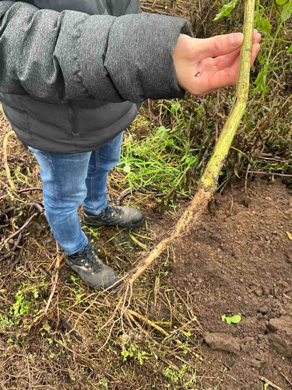 Der Ölrettich wächst „beinig“ und macht viele Seitentriebe. Dies ist eins der Anzeichen für die Dichtlagerung des Oberbodens. Die Spatenmaschine hat den Boden auf 10 cm zusammengedrückt.