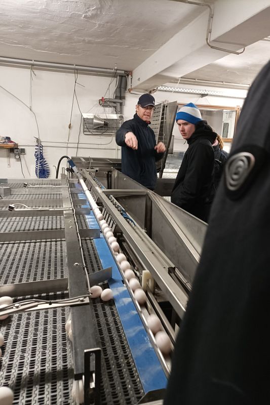 Im Anschluss daran wurde Hof Mertenskötter in Ahlen, ein Legehennenbetrieb mit Direktvermarktung besucht. Auf diesem Betrieb hatten wir ebenfalls einen Einblick in den Stall. Das Besondere dort war, dass das Futter jeden Tag frisch für die Hühner gemischt wird. Ebenfalls interessant war die Eiersortiermaschine, die die Eier, nach Gewicht sortiert, gleichzeitig mit dem Eierstempel bedruckt und dann auf die Eierlagen oder sogar direkt in die 10er-Schachtel setzt.