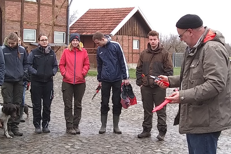 In der vergangenen Woche wurde an der Fachschule Münster-Wolbeck für alle Klassen im zweiten Jahr des Bildungsganges eine eintägige Schulung zum Thema Obstgehölzschnitt durchgeführt. In Ladbergen, Senden und Datteln wurden in landwirtschaftlichen Betrieben praktische Tipps für eine sach- und fachgerechte Pflege von Obstbäumen gegeben. Unterstützt wurde die Fachschule dabei von Mitarbeitern Biologischer Stationen. Bei diesem Lernangebot geht es zum einen darum, konkrete Maßnahmen für Insekten- und Vogelschutz kennenzulernen und anzuwenden. Damit kann etwas Positives für den Artenschutz und die Biodiversität in landwirtschaftlichen Betrieben erreicht werden. Gleichzeitig werden Forderungen der Gesellschaft erfüllt. Zum anderen wurden Tipps gegeben, wie man mit möglichst geringem Aufwand Obstbäume gesund und ertragreich erhält. Drittens besteht die Pflicht, Obstwiesen, die als naturschutzrechtliche Ausgleichsmaßnahmen für durchgeführte Baumaßnahmen angelegt wurden, über mindestens 20 Jahre am Leben zu erhalten. Und wenn beim freiwilligen Vertragsnaturschutz zusätzliche Fördermittel zur Verfügung gestellt werden, sollten auch diese finanziellen Leistungen in Anspruch genommen werden. Die Studierenden erhielten nach einer kompakten Einführung in den sach- und fachgerechten Obstbaumschnitt die Möglichkeit, das Gelernte selbst an pflegebedürftigen Obstbäumen zur Anwendung zu bringen.